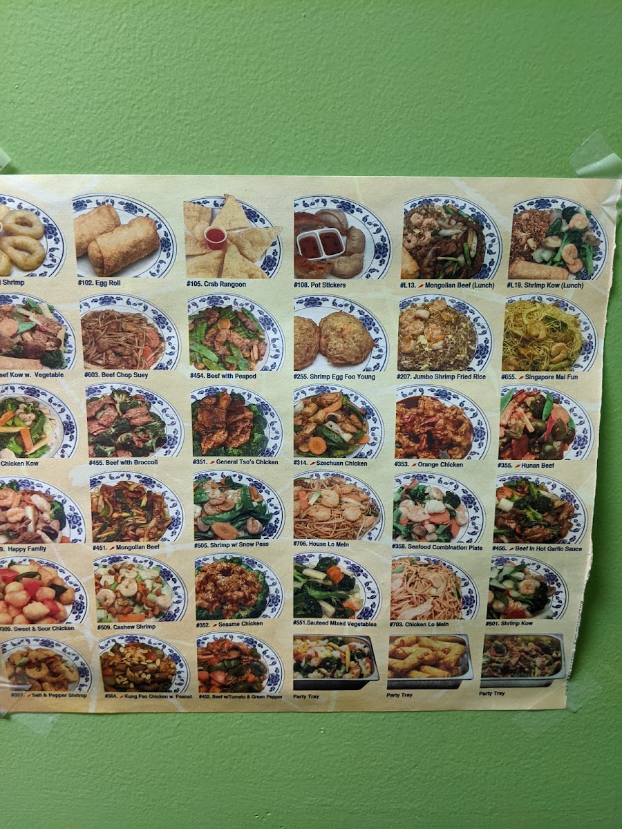 Egg drop soup, four egg rolls, four crab Rangoon, general Tso's chicken, sweet and sour chicken, Szechuan beef, shrimp kow with vegetables, 1 1/2 large shrimp fried rice and cookies. Hot and spicy. No substitutions.
